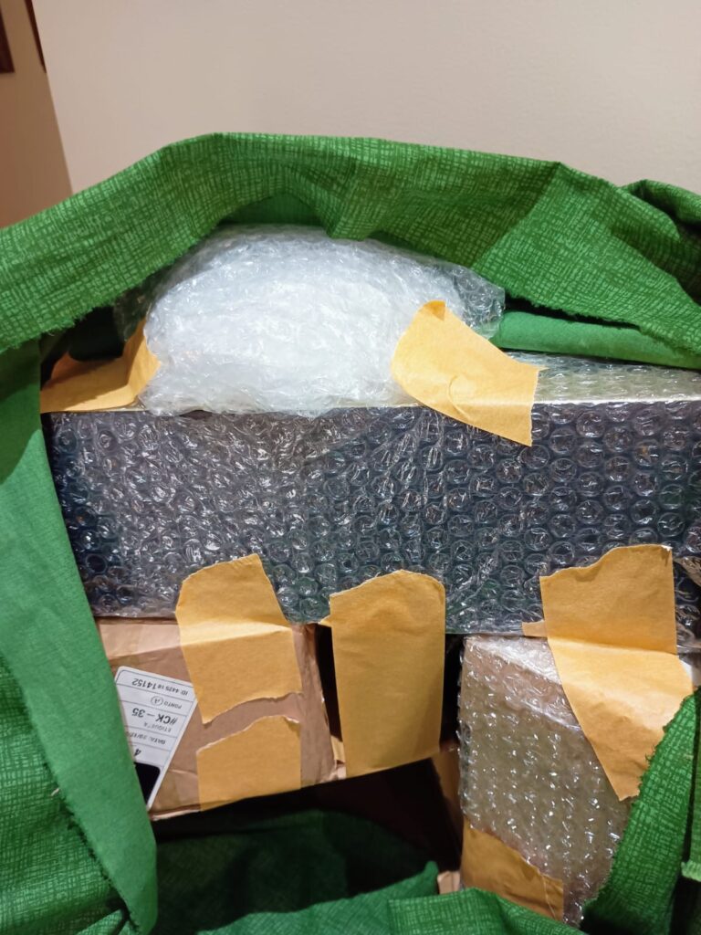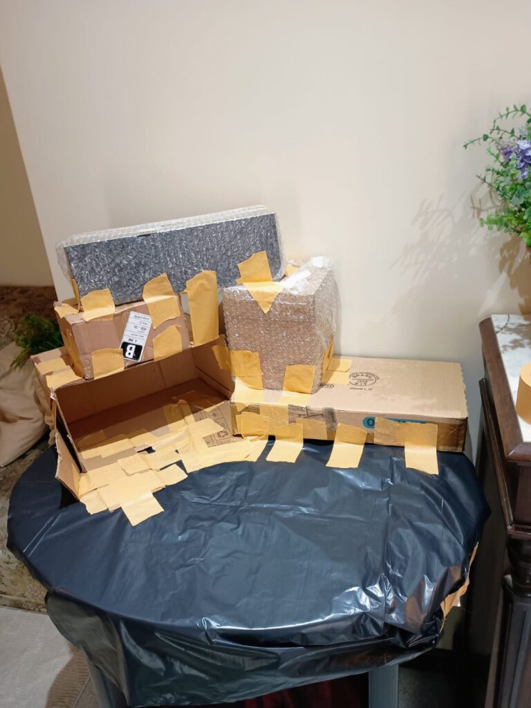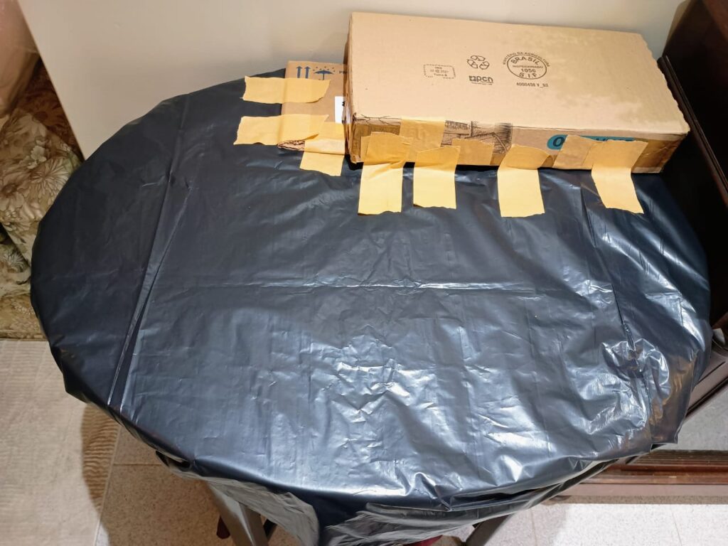Etapa 01 – Como sempre protejo o móvel com plástico e começo a colocação das caixas com fita adesiva.