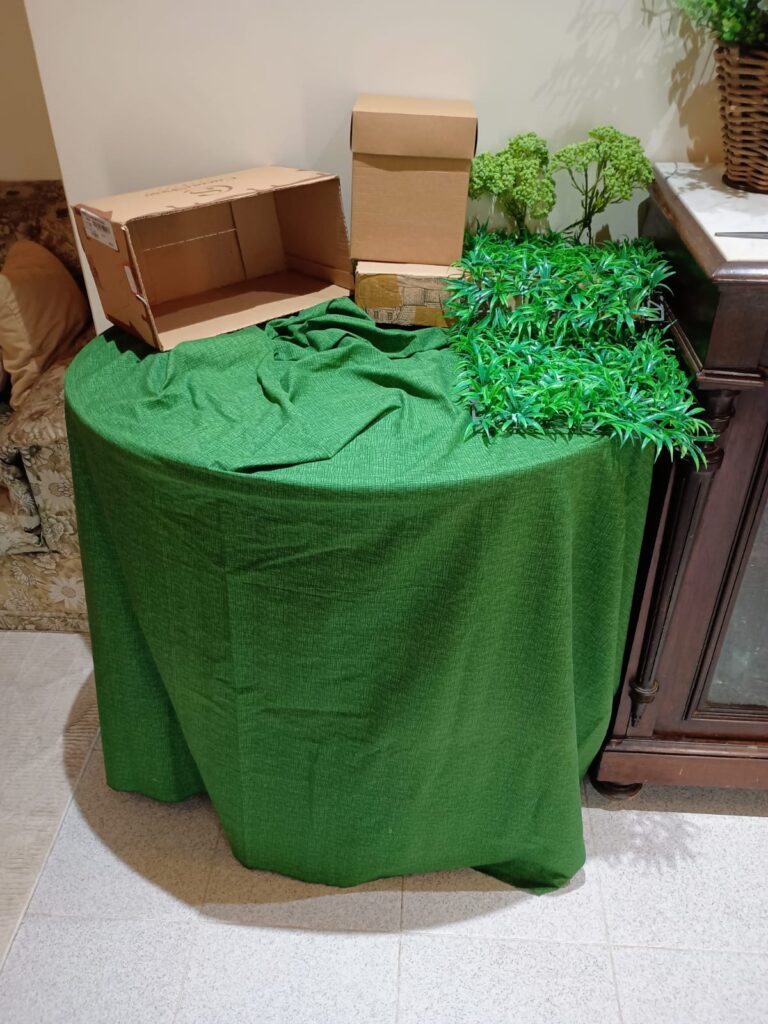 Etapa 03 – Agora colocando o tecido verde que servirá de base para o presépio, inclusive dentro da gruta. Para dar firmeza na hora da colocação das peças, coloco uma placa de papelão a mais sobre o tecido de base na gruta. Ao lado, duas placas de grama artificial e galhos com aparência de pequenas árvores.