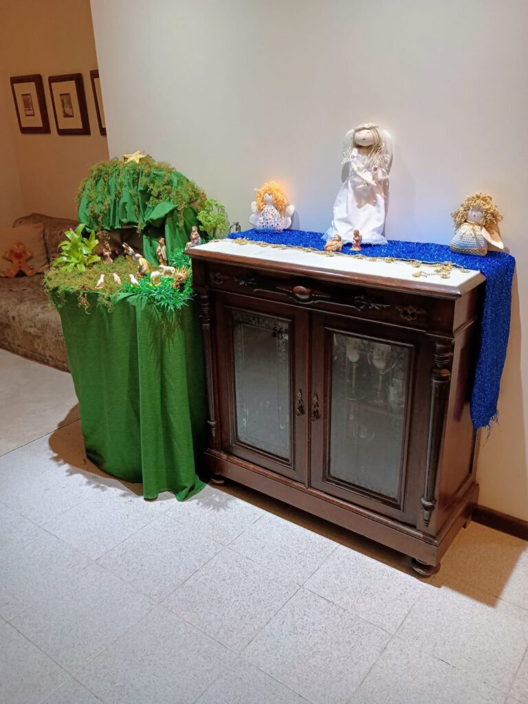 Etapa 06 – Aqui aparece o pequeno presépio que consegui fazer este ano, ao lado do balcão que não fez parte da montagem, mas aproveitei para colocar enfeites de anjos.