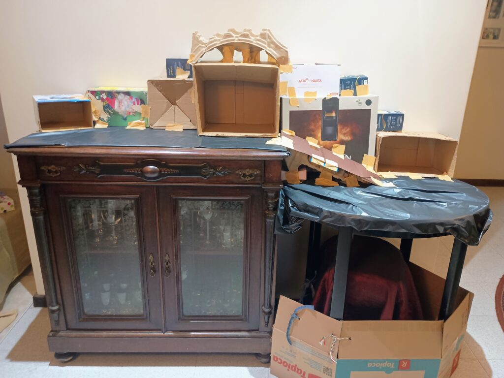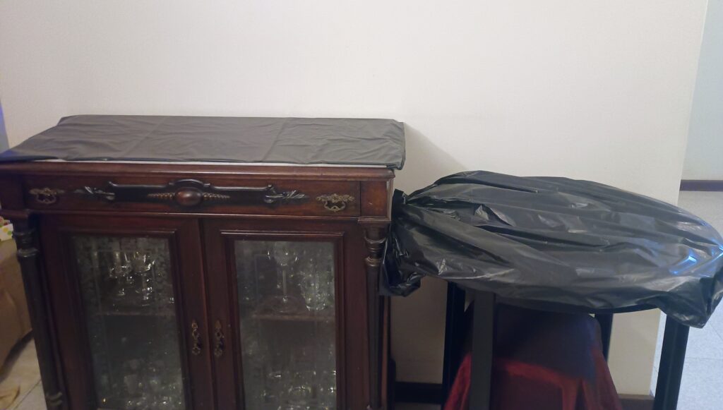 Etapa 01 – Os móveis que serão usados como base para o presépio precisam ser cobertos com plástico para proteção e também para fixar os tecidos que serão usados depois, possibilitando eles serem presos com alfinetes.