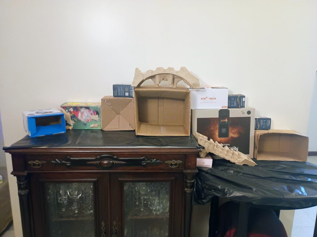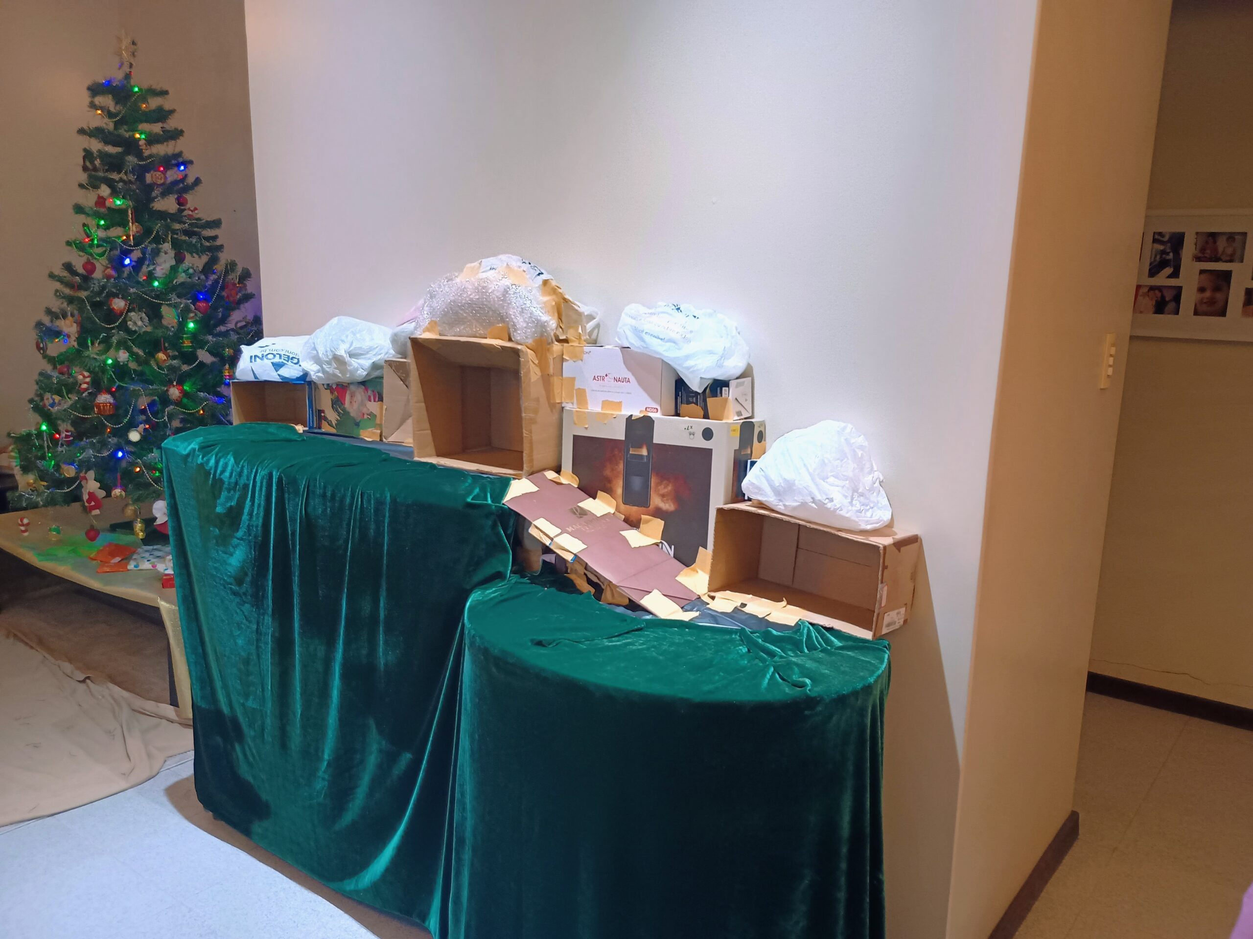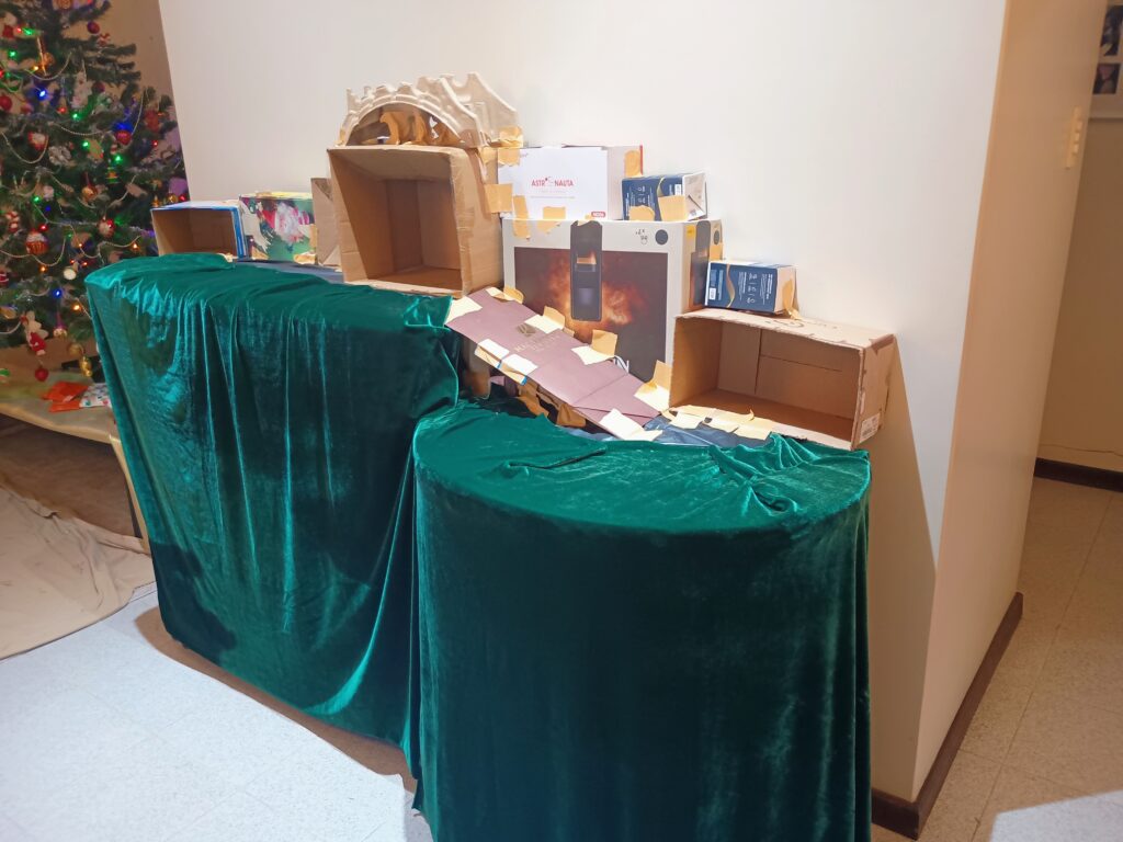 Etapa 02– Colocação das caixas que se transformarão em montanhas, grutas e também numa rampa que permitirá a ligação entre os dois planos do presépio.