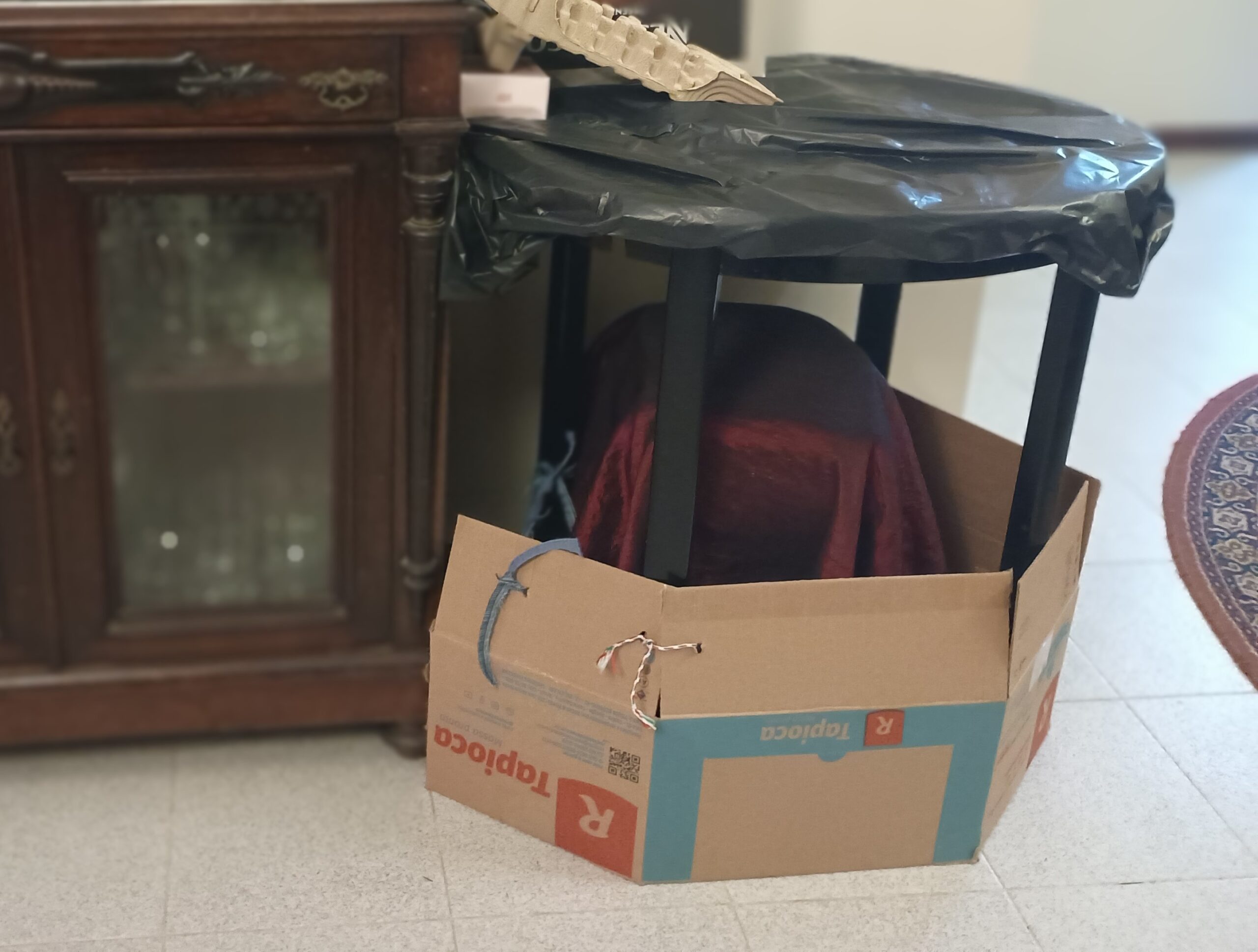 Etapa 03 – Nesta foto dá para perceber que todas as caixas estão bem fixadas entre si e na base, para que tudo fique bem seguro. Junto ao chão, envolvendo as pernas da mesa, nota-se que foi feita uma proteção para impedir que o filhote de cachorro que existe na casa possa se esconder debaixo do presépio, podendo causar a desmontagem do mesmo. Uma caixa de papelão bem forte foi desmontada e amarrada com cordas promovendo a proteção.