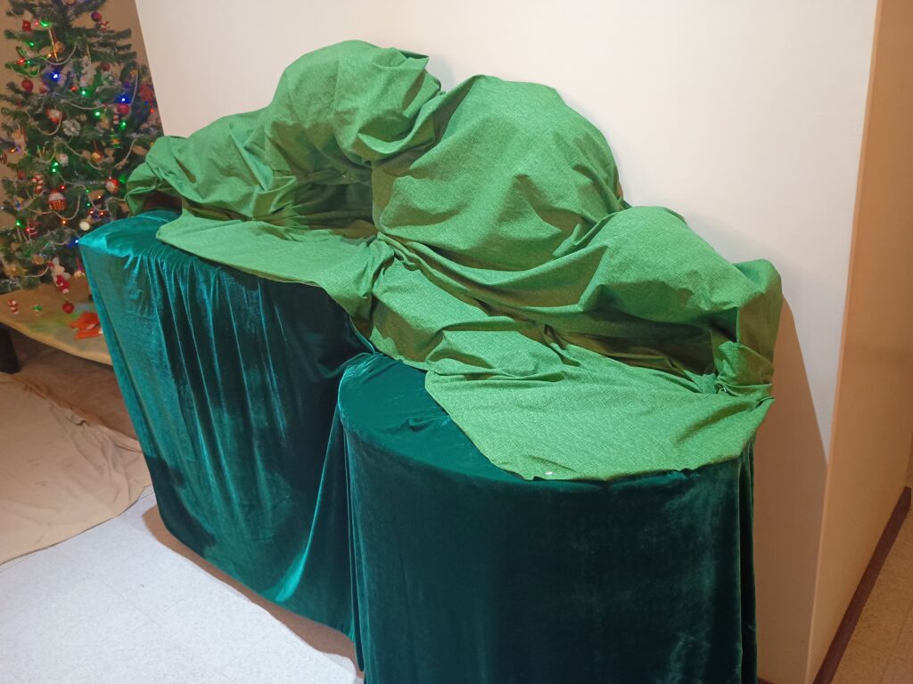 Etapa 05 – Aqui já aparece a base do presépio coberta com dois pedaços de veludo verde, toda modelada com auxílio de alfinetes, prendendo o tecido ao plástico colocado anteriormente na superfície dos móveis. Obs.: O pedaço de veludo colocado à esquerda foi preso de forma a permitir abrir a porta da cristaleira para tirar e repor os copos e taças usados na ceia de Natal.