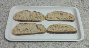 Coloque as fatias de pão numa assadeira espalhando por cima o creme de ricota.