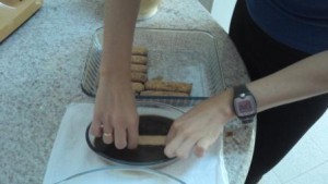 Mergulhar um a um os biscoitos no café frio (com um pouco de leite) para que o absorvam levemente.